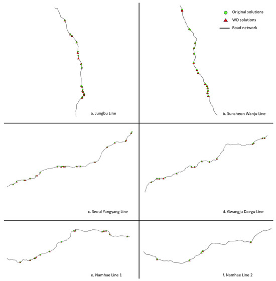 Figure 7 shows the optimal locations for six highways, with green circles representing the preferred locations for scenario 1 and red triangles representing preferred locations for scenario 2 on the road networks. When the original solution locations and WD solution locations coincide, the green circles are shown on top of the red triangles. As seen in Figure 7, many of the preferred locations generated in the two scenarios overlap, especially for Namhae Line 2, where all the selected locations were overlapped, and for Gwangju Daegu Line, where only one station was not overlapped. This indicates that WD-matched semivariogram models can yield solutions similar or identical to those produced by original semivariogram models. This shows the consistency of using WD-matched semivariogram models in identifying preferred locations. It signifies that the WD-matched semivariogram models are robust and reliable alternatives to the original semivariogram models.