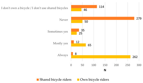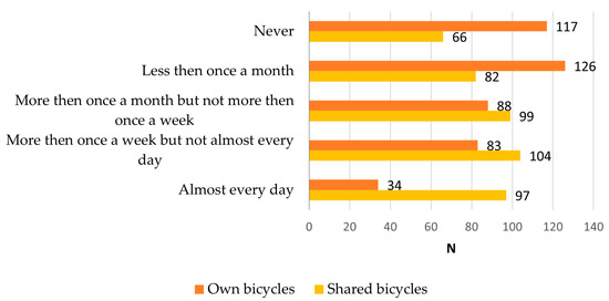 Filtering for users who use exclusively either private or shared bicycles, the difference between “only own bicycle users” and “only shared bicycle users” was significant; t(141) = −6.72, p < 0.001; t(141) = −6.72, p < 0.001; t(141) = −6.72, p < 0.001. Due to unequal variances (p < 0.05 on Levene’s test), Welch’s t-test also confirmed the result; t(29.4) = −4.63, p < 0.001; t(29.4) = −4.63, p < 0.001; t(29.4) = −4.63, p < 0.001.