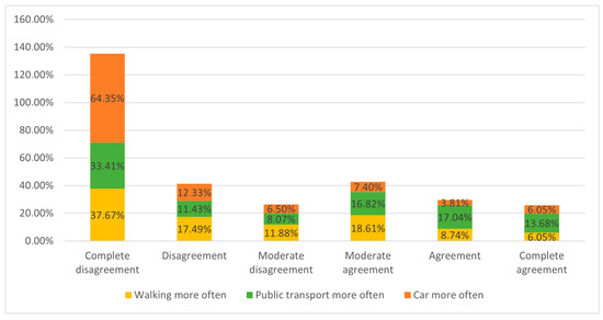 In terms of alternative modes of transportation, most respondents disagree or completely disagree with the statement that they would use the car more often, between approximately 15% and 30% of respondents. The full results are presented in Figure 3.