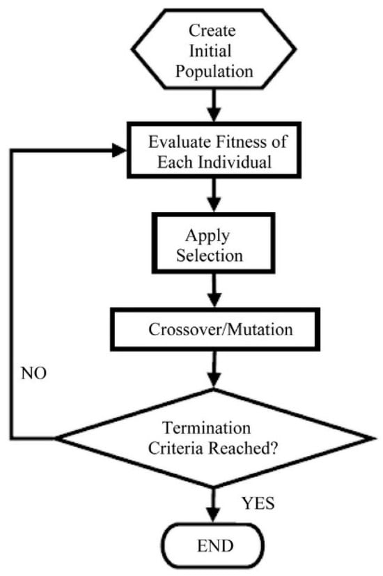 The genetic algorithm operates in a cyclical manner, iteratively refining the population of potential solutions. As illustrated in Figure 1, the process begins with the random generation of an initial population of individuals, each encoded as a chromosome representing a solution to the optimization problem.