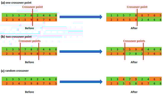 The selected individuals undergo crossover, a genetic operation that involves exchanging genetic material between pairs of parents to create offspring. This process aims to generate new solutions by combining the desirable characteristics of the parents [18]. Three common crossover methods include (see Figure 2):