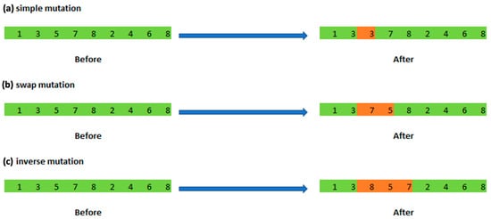 Genetic algorithms incorporate a mutation process to introduce diversity into the population and prevent premature convergence. During mutation, the genetic material of offspring is randomly modified, allowing for variations to arise. Mutations typically involve one or more changes in chromosomes [19]. A simple mutation involves altering a single gene within a chromosome. Other mutation methods include swap mutation and inverse mutation. In swap mutation, two genes are randomly selected, and their positions are exchanged. In inverse mutation, two gene positions are chosen randomly, and the sequence of genes between those positions is reversed [20]. Visualizations of these mutation methods are provided in Figure 3.
