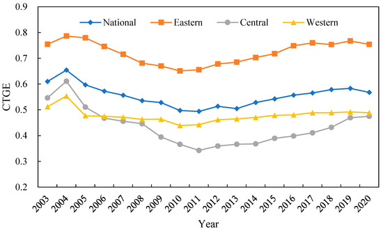 Overall, as shown in Figure 2, the CTGE across different regions of China exhibited a pattern of initial decline followed by growth between 2003 and 2020. Specifically, CTGE fell and fluctuated between 2003 and 2010, then rose consistently after 2010. The eastern region demonstrated the highest CTGE during the study period, with an average value of 0.722, followed by the western and central regions, with averages of 0.478 and 0.434, respectively. The eastern region’s superior performance can be attributed to its leading role in China’s social and economic development, bolstered by significant advantages in “hard” factors such as location, investment levels, infrastructure, and technological innovation, as well as “soft” factors like policy implementation, economic benefits, environmental awareness, and social welfare. In contrast, the central region, despite its strong economic growth following the implementation of the Central Plains Rising Strategy in 2006, ranked last. This was largely due to an overemphasis on speed and quantity in transportation development, which came at the expense of efficiency and quality, leading to a mismatch between social and economic growth. Consequently, CTGE in the central region fell sharply, even lagging behind the western region. While it displayed a consistent upward trend after 2010, the earlier efficiency losses were not fully offset by subsequent growth.