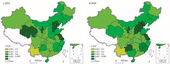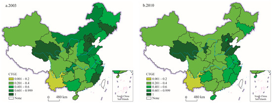 As Figure 3 illustrates, eight of China’s thirty regions—Beijing, Tianjin, Hebei, Jilin, Shanghai, Fujian, Qinghai, and Ningxia—achieved a CTGE of 1 in 2003. Seven regions fell within the medium efficiency range (0.401–0.600), while Inner Mongolia, Zhejiang, Shandong, Henan, Hainan, and Chongqing fell within the higher efficiency range (0.601–0.999). The remaining regions were distributed between the low (0.001–0.200) and lower (0.201–0.400) efficiency ranges. By 2010, CTGE had decreased significantly compared to 2003, with the number of regions achieving an efficiency value of 1 dropping to six. No regions remained in the higher efficiency range (0.601–0.999), while the number of regions in the lower and medium efficiency ranges increased substantially. In 2015, Beijing advanced to the higher efficiency range (0.601–0.999), while the number of regions with a CTGE of 1 remained unchanged. During this period, the number of regions in the medium efficiency range (0.401–0.600) increased, while the number in the lower efficiency range declined, indicating an overall improvement in CTGE. By 2020, the number of regions with a CTGE of 1 increased to eight, with Jiangxi and Fujian moving from the medium efficiency range to the higher efficiency range. Other regions exhibited little change, suggesting that CTGE in China followed a trend of initial decline followed by subsequent growth during the study period.