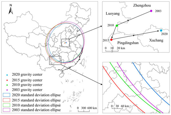 The spatial trajectory of China’s CTGE gravity center shifted from the southwest to the northeast, indicating a dramatic decline in CTGE in the northeastern regions during the early stages, followed by significant growth in the eastern regions in later stages. The standard deviation ellipse analysis shows that the spatial distribution of China’s CTGE is becoming more centralized.
