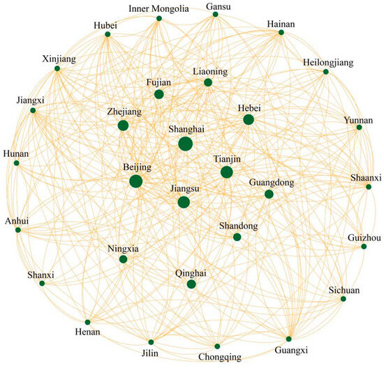 The spatial correlation matrix for China’s inter-provincial CTGE was constructed using the VAR-based Granger causality test, and the resulting spatial correlation network for 30 regions was visualized using Gephi software 0.9.5 (see Figure 5). This network highlights the interdependencies and interactions between provinces, offering insights into the structural relationships and the overall connectivity of CTGE across China.