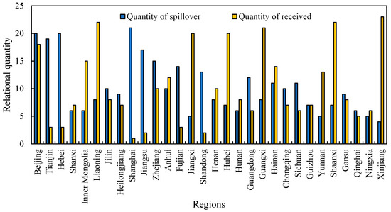 (1) Variations in the quantity of connections: As shown in Table 5, 11 provinces had spillover relations exceeding the average of 10.3 during the study period. Shanghai, Beijing, Hebei, Tianjin, and Jiangsu ranked highest, whereas Xinjiang, Ningxia, Qinghai, and Yunnan had the fewest. Regarding receiving relationships, Shanghai, Jiangsu, Shandong, Hebei, and Tianjin received fewer connections than regions such as Xinjiang, Shaanxi, Guangxi, and Hubei. Figure 6 indicates 15 regions with positive net spillover relations, including Shanghai, Hebei, Tianjin, Jiangsu, Fujian, and Shandong, which had more than 10 net spillover relations. Conversely, 14 regions exhibited negative net spillover relations, with Xinjiang, Shaanxi, and Jiangxi having fewer than −10. On the whole, spillover effects were predominantly manifested in the eastern region, whereas net benefit effects were the prevailing factor in the central and western regions.