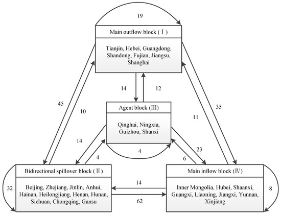 The block model of China’s inter-provincial CTGE spatial correlation network was analyzed using Ucinet 6 software, based on the spatial relationship matrix of China’s inter-provincial CTGE. This analysis reveals the internal structural features of the spatial correlation network. To further examine the transfer patterns between CTGE blocks, a spatial correlation diagram was constructed, and the density matrix and image matrix of China’s inter-provincial CTGE spatial correlation blocks were generated using principles commonly applied in current research. The results are presented in Table 6 and Table 7 and in Figure 7.