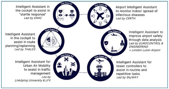 It is useful to put HAT into context by considering actual examples of use cases. This paper is based on research under the auspices of the Horizon Europe HAIKU project (https://haikuproject.eu/ accessed on 20 March 2025), which is exploring six futuristic HAT use cases—two cockpit, two air traffic, and two airport—with varying levels of AI autonomy. Three of the use cases are more team-oriented in nature (the other three are more similar to machine learning support for an airport, use of a chatbot by passengers, and an early concept study of AI controlling drone traffic with very little human interaction), as outlined below and illustrated thematically in Figure 1 (all six use cases are shown):