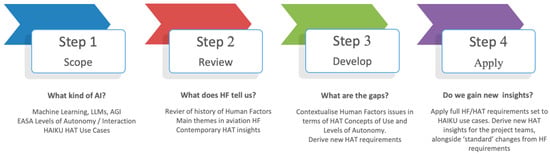 The development of a preliminary set of new Human Factors HAT requirements for aviation applications has been guided by four over-arching questions, shown as four steps in Figure 2: