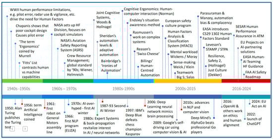 Timeline of Parallel Evolution of AI (lower section) and Human Factors (upper section).