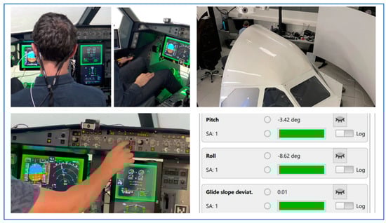 Images from HAIKU Use Case 1 simulation (FOCUS simulation development at Ecole Nationale Aviation Civile (ENAC) Labs, Toulouse, France) [10], showing the cockpit simulator (top right), a pilot in the cockpit being supported after startle (top left), an extract from the eye tracking analysis of key parameters the pilot may need to focus on (bottom right), and highlighted directed situation awareness (vertical speed) on the primary flight display (PFD) (bottom left).