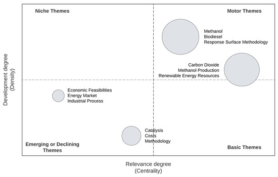 The thematic analysis of the documents reveals patterns and areas of focus around environmentally sustainable technologies, energy efficiency, and the production of alternative fuels (Figure 1). “Carbon dioxide” leads in occurrences within the cluster, showing high centrality among the keywords. Methanol production-related subjects are also identified as areas of significant interest, reflecting the ongoing search for more sustainable and efficient energy processes and systems. The emphasis on “renewable energy resources” underscores the importance assigned to sustainable energy sources in the global energy transition. Economics, costs, and market and sensitivity analyses are recognized for their relevance in assessing the viability and performance of energy projects, suggesting a holistic approach that integrates economic considerations into the development of sustainable energy solutions. Interestingly, catalysis appears as a distinct cluster, reflecting its critical importance in facilitating efficient chemical reactions for the production of sustainable fuels and chemicals.