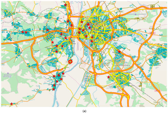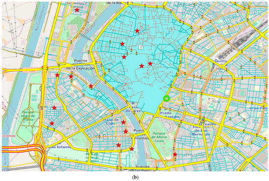(a) Points of delivery (red stars) and distribution centre (red ring). Adjacent PODs are grouped in the same red star. (b) Planned Low Emissions Zone in Seville (in blue), points of delivery (POD—red stars) and alternative warehouse for city centre deliveries (green ring). Adjacent PODs are grouped in the same red star.