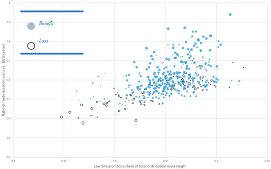 Figure 2 is an illustration of the variance of the estimates, using the example of scenario DET2. In 369 of the 500 simulations (73.8%), the total costs for scenario DET2 in 2030 are estimated to be lower than those for the baseline scenario C, i.e., a shift to a combination of BEV’s, cargo tricycles and bicycles in the LEZ with an intermediate distribution centre would result in an economic benefit for the operator. The median corresponds to an annual benefit of EUR 17,600, with a mean of EUR 13,800, maximum of EUR 48,100 and minimum of EUR −32,500 (loss). The x-axis in Figure 2 represents the ratio of the total route distance within the zone served through the intermediate distribution centre, compared to the total route distance if all deliveries are made directly from the main distribution centre. A higher ratio corresponds to the intermediate distribution centre being closer to the main distribution centre and –as a consequence- at a longer average distance from the delivery points. The y-axis represents the ratio between the time required to cover each route by van and that by electric bi/tri-cycle. This ratio captures the difference in speed between the two modalities and can be a proxy for the difference in driver productivity. The size of the bubbles in the graph represents the total benefit or loss for the operator in scenario DET2, compared to the baseline C. It is obvious from the graph that there is a sweet spot where scenario DET2 is consistently more beneficial than the baseline scenario. Most simulations that estimate a benefit are concentrated towards cases where the delivery destinations are located at shorter distances from the city warehouse and can be accessed through the city’s cycling network. In such cases, cargo bi/tri-cycles may be more efficient than delivery vans, despite their lower speed and capacity. The cases where the combination of a city warehouse with bi/tri-cycles may operate at a loss tend to concentrate in two regions of Figure 2: towards the right side of the figure, in cases where the delivery points are spread widely across the city, direct distribution from the central distribution point may be more efficient than using the city warehouse as an intermediate distribution centre; and towards the bottom left of the figure, in cases where the delivery points are located in less dense areas, the operational efficiency of bi/tri-cycles is lower than that of delivery vans.