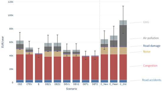 Figure 3 summarizes the external cost estimates in the 2025 scenario. The estimates are a combination of fleet composition described in Table 3 and Table 4 with vehicle externalities’ factors on a per vehicle/kilometre basis. The baseline diesel fleet, corresponding to scenario ‘C’, is the baseline where all deliveries are performed by vehicles with Euro II to Euro V emission standards (i.e., we take the mean emission estimates between these two standards). In this scenario, we estimate that the annual external costs of operating two trucks and six conventional diesel vans, to meet the beverage demand of business in the metropolitan area of Seville, could vary between EUR 75,000 and 115,000. The main factors contributing to these costs are congestion, air pollution, noise and GHG emissions. The analysis finds that the main external cost reductions, derived from introducing BEV and tri/bicycles and compared to the baseline scenario, are in terms of GHG emissions, air pollution and noise. These environmental benefits are more pronounced in scenarios “E”, “DET1” and “DET2”, where internal combustion engine vehicles are entirely excluded. These are followed by scenarios “CTEV”, “DEV1” and “DEV2”, which permit the incorporation of conventional trucks in the fleet mix only for operating delivery routes in the city outskirts.