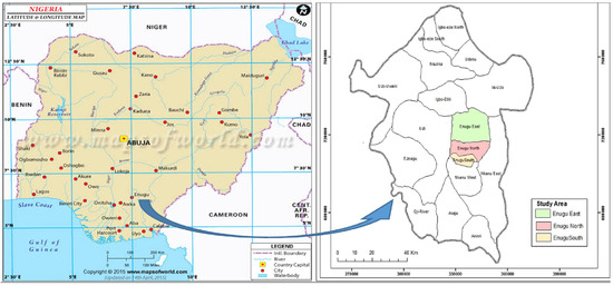 Map of Nigeria showing Enugu State; map of Enugu State showing study area [9].