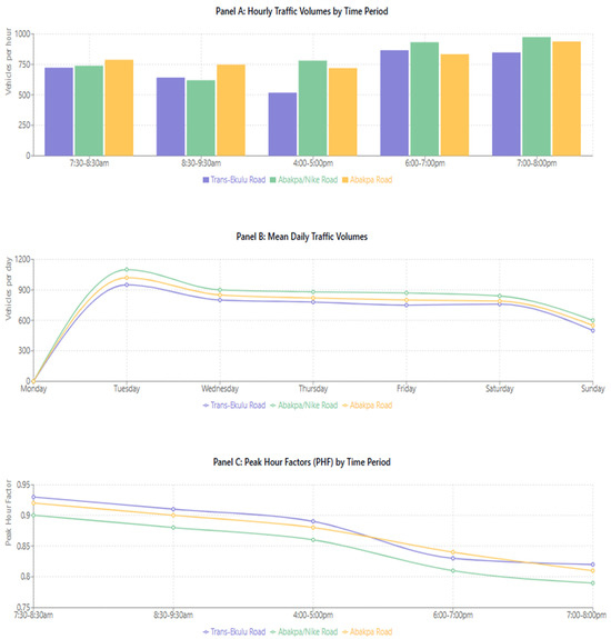 The spatiotemporal traffic dynamics across Enugu’s major distributors. Note: (Panel A) illustrates traffic volumes across different time periods, showing spatial variations between distributors. (Panel B) demonstrates the weekly pattern across distributors, highlighting the absence of traffic on Mondays and peak volumes on Tuesdays. (Panel C) shows the correctly calculated peak hour factor (PHF = V/(4 × V15)) for each distributor by time period.
