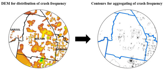 Digital Elevation Models (DEMs) are crucial for analyzing how topography influences road crash frequency. DEM-derived features like elevation and slope affect roadway geometry, visibility, and drainage, impacting crash risk [52]. Using ESRI ArcGIS Pro 3.4.2, we extracted 1 m contour lines from DEMs and overlaid geocoded crash data to identify concentrations relative to elevation changes. Crash frequency was aggregated within contours via spatial joins, and Kernel Density Estimation (KDE) helped visualize hotspots, particularly revealing higher occurrences in areas with lower elevations and steep slopes [52] (Figure 1).