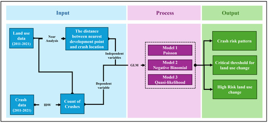 The conceptual and procedural framework illustrated in Figure 3 uses a systematic approach to investigate the relationship between urban development (land use change) and traffic crash occurrences over time. The framework begins with input data comprising land use changes and the count of crashes from 2011 to 2021, where a Near analysis is used to calculate the distance from the newest development points to each crash location. These distances, along with the spatially interpolated crash data (via IDW), are used as independent and dependent variables, respectively. The procedural framework then applies a Generalized Linear Model (GLM) using three types of statistical models—Poisson, Negative Binomial, and quasi-likelihood—to examine these relationships. The output of this framework reveals the crash risk pattern based on the urban development (land use change), identifies a critical distance zone for land use change, and highlights high-risk land use change areas, thereby offering valuable insights for planners and policymakers aiming to mitigate traffic-related risks in evolving urban environments.