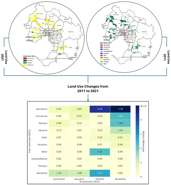 Figure 4 illustrates the land use transformation within the Greater Metropolitan Area (GMA) between 2011 and 2021. It presents a visual comparison of spatial land use distributions across two time points, accompanied by a matrix showing percentage transitions between land use categories. Notably, a substantial proportion of agricultural land (7.78%) has been converted to residential use, indicating a significant urban expansion trend. Additionally, agricultural areas were also transformed into parkland (4.39%) and education zones (0.64%). These changes reflect broader socio-economic pressures and urban development priorities shaping GMA’s evolving landscape.