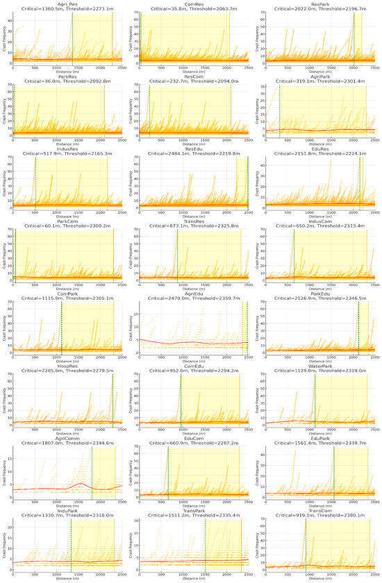 This approach provided a quantitative measure of each crash location’s proximity to specific land use transitions, supporting the hypothesis that certain land development patterns may increase or decrease crash frequency based on spatial closeness (Figure 2A).