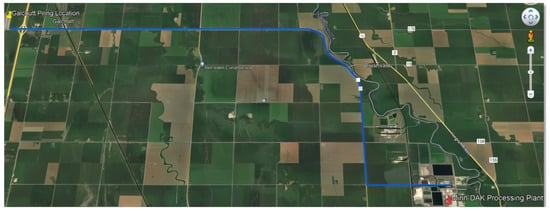 North Dakota is emerging as a pivotal testing ground for autonomous trucking technology in the United States, with its unique geographical and economic conditions driving adoption []. The state’s vast agricultural landscape, coupled with long transport distances and labor shortages, presents an ideal use case for Avs []. Autonomous trucking has already seen implementation through projects such as the Minn-Dak Farmers Cooperative’s leader-follower platooning system, where sugar beets are transported between piling locations and processing facilities using a human-driven lead vehicle followed by an autonomous truck (see Figure 1). This system, operational during the 2023–2024 harvest season, leverages advanced technologies such as real-time kinematic GPS and encrypted vehicle-to-vehicle (V2V) communication to ensure seamless operations in rural areas. The program demonstrated significant resilience under harsh winter conditions, showcasing the technology’s ability to consistently navigate snow, ice, and extreme cold. Such advancements highlight North Dakota’s commitment to pioneering AV integration in the agricultural sector. Therefore, it is necessary to note that the goal of developing the Miin-Dak Farmers’ Cooperative is not to eliminate the driver but rather to offer an alternative when qualified drivers are unavailable.