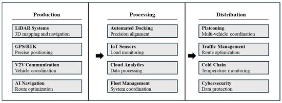 Similarly to the Brønnøy Kalk project with Volvo Autonomous Solutions [], which focuses on deploying a commercial autonomous transport solution for transporting limestone from a mine to a crusher, Figure 2 shows technology deployment across sequential supply chain stages. This indicates process flow and technological interdependencies between production, processing, and distribution operations. At the Production level, ATS relies on LiDAR for precision navigation in unstructured farm environments, enabling 3D mapping and real-time obstacle detection. AI-powered navigation systems dynamically adjust routes based on soil conditions, crop placement, and environmental factors, ensuring smooth movement across fields []. Additionally, autonomous harvesting integration allows seamless coordination between harvesters and autonomous trucks, reducing downtime and labor dependency [,]. Vehicle-to-Everything (V2X) communication enhances connectivity, enabling real-time data exchange between trucks, farm machinery, and storage units for synchronized workflow. At the Processing and Storage stage, GPS and Real-Time Kinematic (RTK) positioning provide high-precision route tracking, ensuring efficient transport of crops from fields to silos, cold storage, or processing facilities []. Fleet telematics and IoT sensors enable real-time monitoring of perishable goods, ensuring quality control while optimizing fuel efficiency []. Moreover, autonomous docking and loading systems streamline truck alignments for automated grain loading and unloading, thereby reducing human intervention and minimizing waste []. Conversely, cloud-based analytics enhance predictive maintenance, fuel efficiency, and route optimization, ultimately minimizing supply chain disruptions [].