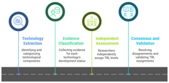 To systematically evaluate technology maturity, each technological component identified in the literature was assessed using the nine-level Technology Readiness Level (TRL) framework developed by NASA. As illustrated in Figure 4, the TRL assessment process involved four stages.