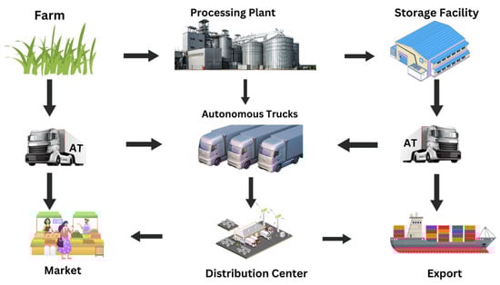 The convergence of artificial intelligence, sensor technologies, and autonomous systems is fundamentally reshaping transportation paradigms across multiple sectors, with agricultural supply chains emerging as a critical frontier for technological transformation. These technologies enable vehicle navigation and task execution without human intervention []. Although much attention has been paid to their applications in passenger transportation and urban mobility, autonomous trucks are a watershed moment, with enormous promise for industries that rely on logistics and heavy-duty transport []. Therefore, the integration of Autonomous Truck Systems (ATS) into agricultural supply chains represents a paradigm shift from traditional logistics models toward precision-driven, technology-enabled operations that can address persistent challenges of labor shortages, operational inefficiencies, and supply chain vulnerabilities [].