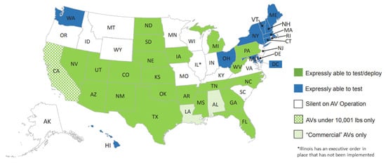 - Fagnant, D.J.; Kockelman, K. Preparing a nation for autonomous vehicles: Opportunities, barriers and policy recommendations. Transp. Res. Part A Policy Pract. 2015, 77, 167–181. [Google Scholar] [CrossRef]