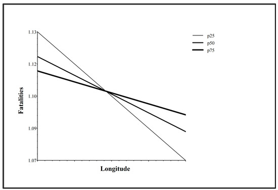 Figure 4 shows how the licensed drivers effect on fatalities changes by longitude in the Eastern time zone. The negative slopes for p25, p50, and p75 show that fatalities decrease from west to east in the Eastern time zone. At western longitudes of the Eastern time zone, fatalities are highest in states where licensed drivers per 1000 driving-age population are less numerous, such as in Kentucky. At eastern longitudes of the Eastern time zone, fatalities are highest in states where licensed drivers per 1000 driving-age population are more numerous, such as in Vermont. The point of intersection of the negative slopes for p25, p50, and p75 in Figure 4 represents the longitude where the licensed drivers effect is null in the Eastern time zone.
