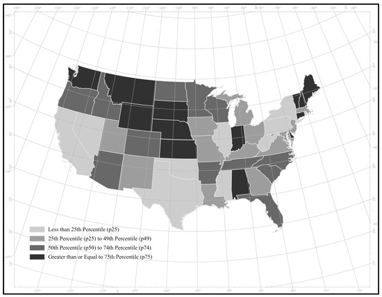 Figure 1 shows how the licensed drivers effect on fatalities changes by longitude in the contiguous United States. The negative slopes for the 25th (p25), 50th (p50), and 75th percentiles (p75) show that fatalities decrease from west to east. At the western longitudes of the contiguous United States, fatalities are highest in states where the licensed drivers per 1000 driving-age population are less numerous, such as in California. At the eastern longitudes of the contiguous United States, fatalities are highest in states where licensed drivers per 1000 driving-age population are more numerous, such as in Vermont. The point of intersection of the negative slopes for p25, p50, and p75 in Figure 1 represents the longitude where the licensed drivers effect is null in the contiguous United States. Figure 2 is a choropleth map of licensed drivers per 1000 driving-age population in the contiguous United States. Manual classification represents the following four classes: less than 25th percentile (p25); 25th percentile (p25) to 49th percentile (p49); 50th percentile (p50) to 74th percentile (p74); and greater than or equal to 75th percentile (p75) of licensed drivers per 1000 driving-age population. Class breaks represent p25, p50, and p75 of the licensed drivers distribution. The graticule of longitudes in Figure 2 shows that the following states (from north to south) represent the geographic location from about −100 to −95 where the licensed drivers effect is null in the contiguous United States: North Dakota, Minnesota, South Dakota, Iowa, Nebraska, Missouri, Kansas, Oklahoma, and Texas.
