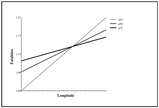 Figure 3 shows how the licensed drivers effect on fatalities changes by longitude in the Pacific and Mountain time zones. The positive slopes for p25, p50, and p75 show that fatalities increase from west to east in the Pacific and Mountain time zones. At western longitudes of the Pacific and Mountain time zones, fatalities are highest in states where licensed drivers per 1000 driving-age population are more numerous, such as in Washington. At eastern longitudes of the Pacific and Mountain time zones, fatalities are highest in states where licensed drivers per 1000 driving-age population are less numerous, such as in New Mexico. The point of intersection of the positive slopes for p25, p50, and p75 in Figure 3 represents the longitude where the effect of licensed drivers effect is null in the Pacific and Mountain time zones.
