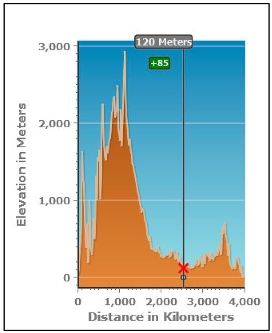 Elevation profile from west (Los Angeles) to east (New York City) coasts of the contiguous United States (X = Mississippi River) [23].