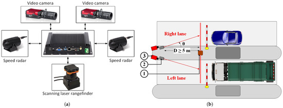 (a) Connection diagram of the vehicle counting and classification system. (b) Spatial arrangement of sensors at a toll station for two adjacent lanes. (1) Scanning laser rangefinder. (2) Speed radars. (3) Video cameras [55].