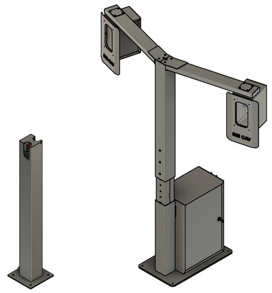 The system’s physical structure ensures reliable performance under high-demand tolling conditions. Made from high-strength, corrosion-resistant steel, its modular design enables easy transport, installation, and reconfiguration. It includes a 1-meter galvanized pole for mounting the laser sensor, an IP65-rated industrial computer and electronics enclosure, and two upper arms with weatherproof housings for cameras and radars. Internal conduits and military-grade connectors protect wiring and ensure electrical stability. With cm adjustable height and angular alignment mechanisms, the CAD-modeled structure (prototyped in Figure 3) offers a durable and flexible platform for advanced vehicle detection and classification.