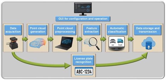 The system comprises interconnected software modules that process data from integrated sensors to generate 3D point clouds of passing vehicles. These are then analyzed and classified into predefined categories using advanced computer vision and pattern recognition techniques. It also includes a module for automatic license plate recognition to manage key vehicle information. Classification results and plate images are stored in structured formats and transmitted to the management system for efficient analysis and use. Figure 4 illustrates the system architecture, and Table 4 details the functional requirements. The software was developed in Python 3.6.9, using the Point Cloud Library (PCL) [56] v1.10.1 for point cloud processing. The following sections present the technical details of each module.