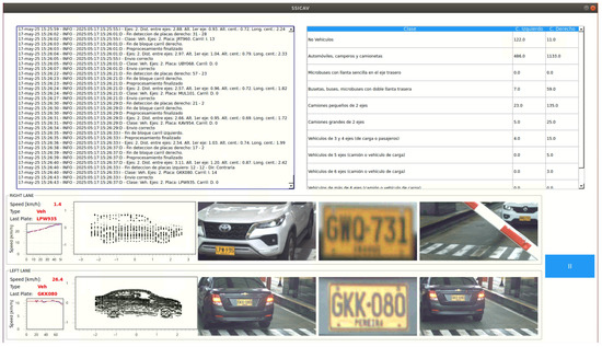 Figure 5 illustrates the GUI operational screen, enabling real-time system performance supervision. Key metrics, such as the number of vehicles processed, classification results, estimated vehicle speed, detected license plate, and the point cloud and photographic record of the latest vehicle for each lane, are updated dynamically. This comprehensive display provides high situational awareness and supports rapid decision-making in the field.