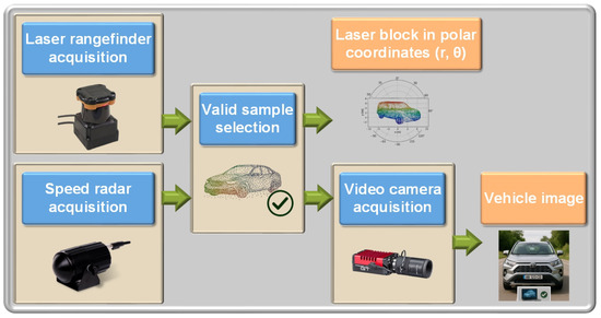 In the data acquisition stage, the system performs sensor configuration and data capture and determines whether the acquired data contains valid information corresponding to a vehicle object. Figure 6 shows the block diagram of the data acquisition module. The laser rangefinder interface uses the HokuyoAIST library [57,58], while communication with the speed sensors relies on the pySerial module, version [59]. Similarly, the system establishes communication with the cameras through the Vimba API provided by the manufacturer, Prosilica [60].