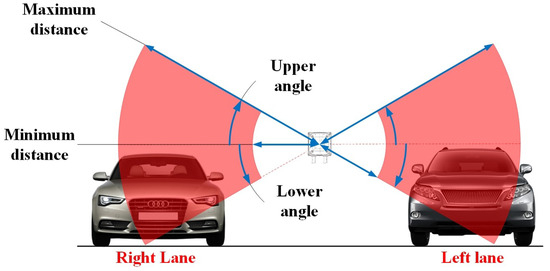This process detects when a vehicle enters the laser sensor’s field of view and initiates a new laser data block that captures all beam measurements during the vehicle’s passage, excluding those associated with zero velocity. For each lane, the system defines a ROI as a conical area in polar coordinates, bounded by specific radial and angular limits (see Figure 7). The ROI excludes irrelevant surfaces such as the ground and nearby obstacles. Once defined, the system continuously monitors objects within the ROI and validates their movement using speed data. It initiates a new data block upon detecting motion and triggers image capture for license plate recognition. The point cloud generation begins once the object exits the ROI and the system has accumulated sufficient valid laser measurements.