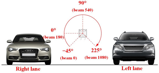 This stage processes the laser data block acquired in the previous step to generate a point cloud representation of the vehicle. The laser scanner operates on a polar coordinate plane in which is oriented horizontally toward the right lane (see Figure 8). It captures measurements across an angular range from to , covering both lanes. The scanner operates at 40 samples per second (SPS), completing a full rotation every 25 milliseconds. With an angular resolution of , each scan yields 1081 data points: 541 corresponding to the right lane and 540 to the left.
