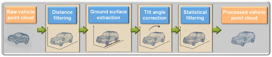 The point cloud preprocessing stage aims to generate a refined vehicle representation by removing background elements, ground surface data, and noise, and correcting tilt distortions. Figure 10 shows the general block diagram of this process. The following subsections describe in detail the four stages illustrated in the figure.