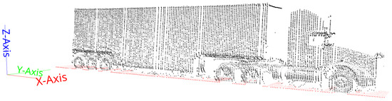 The user adjusts the threshold values according to the specific installation parameters of the laser sensor, using lane width and maximum vehicle height as the main criteria. Figure 11b shows the point cloud from Figure 9b after applying distance filtering. The resulting data isolates the target vehicle and the road surface within the corresponding lane, effectively removing background elements.