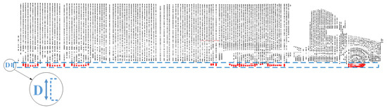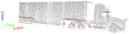 A standard method for segmenting point clouds involves estimating parametric models, such as planes, to isolate structural elements. This stage applies a plane extraction algorithm based on RANSAC to identify and remove the road surface, following the implementation described in [26,27]. The ground is assumed to be the dominant plane, perpendicular to the Z axis and defined by Equation (7). The algorithm selects the plane with the highest number of inlier points within a predefined distance threshold (5 cm) and angular deviation () from the model, then removes those points from the point cloud. With a maximum of 5000 iterations, the method proved effective, as illustrated in Figure 12, where the extracted ground (in red) is separated from the vehicle (in black). Reference [55] describes the details of the implemented algorithm.