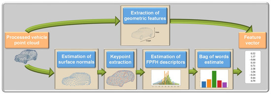The “Feature extraction” column shows a similar transition. Early works relied on global geometric descriptors, such as length, height, or width [46,50]. In contrast, recent contributions incorporate more expressive 3D descriptors like VFH (Viewpoint Feature Histogram), SHOT (Signature of Histograms of Orientations), and FPFH [16,32,47]. These local descriptors capture fine-grained surface information and are more robust to occlusions and noise. The present study distinguishes itself by combining global geometric features (e.g., vehicle length, height) and local shape descriptors, enhancing the system’s ability to differentiate between visually similar classes.