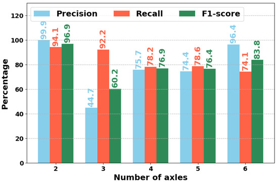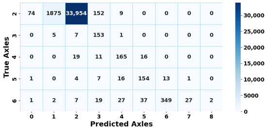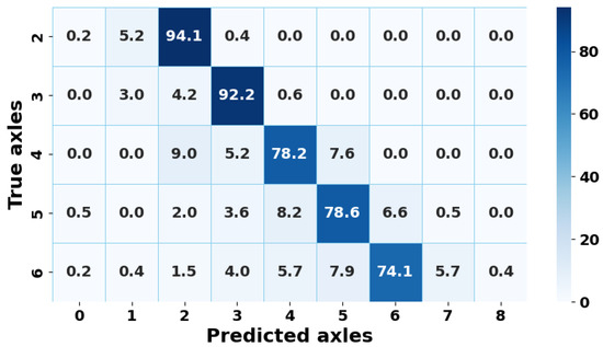 The “Classification accuracy” and “Classification algorithms” columns show that reported accuracy levels in the literature range from to . Studies using more advanced methods, such as deep neural networks or SVMs, generally achieve higher performance (e.g., [23,32,50]). The system proposed in this article reaches an overall classification accuracy of , with powerful results in the classification of heavy vehicles, achieving accuracy in categories involving vehicles with three or more axles. However, differences in classification schemes and dataset sizes across studies limit the possibility of direct comparisons.