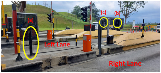 The system uses a robust physical platform composed of a Hokuyo UTM-30LX 2D LiDAR [52], two Stalker stationary speed radars [53], and two Prosilica GT1290C video cameras [54], all connected to a fanless industrial mini-PC housed in an aluminum case, as shown in Figure 1a. This setup enables simultaneous monitoring of two adjacent toll lanes. As illustrated in Figure 1b, each lane is equipped with a dedicated camera and speed radar, while a single LiDAR unit covers both lanes with its wide scanning angle.