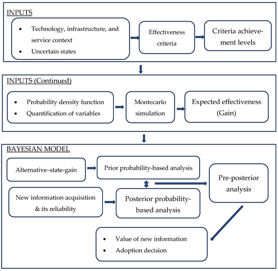 The first two boxes in Figure 1, labelled as “inputs”, define necessary information on technology and service context, characterize uncertain states of technology and infrastructure readiness, define effectiveness criteria, and outline use of the Monte Carlo simulation method to obtain the probability-weighted expected effectiveness estimates that are required by the Bayesian predictive model. The third box shows parts of the Bayesian model. Taken together, these provide answers to questions on the conditions under which CAV adoption will become likely and the role of new information obtainable from demonstrations in reducing uncertainty in CAV adoption for three applications, namely private mobility, shared mobility robotaxi, and shared mobility microtransit service.