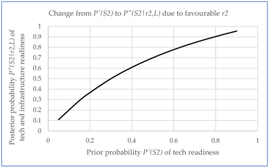 At the time of initiating new information acquisition activity, it is uncertain what the outcome will be. That is, obtaining result r1 or r2 will be uncertain, and therefore, probabilities should be assigned to each. As noted previously, r1 corresponds to state S1 (low technology and infrastructure readiness) and r2 corresponds to S2 (relatively higher readiness). If L has high reliability, the analyst can assign a high conditional probability P(r2|S2,L). If L has limited scope in terms of providing information on the above noted indicators, a low conditional probability can be assigned.